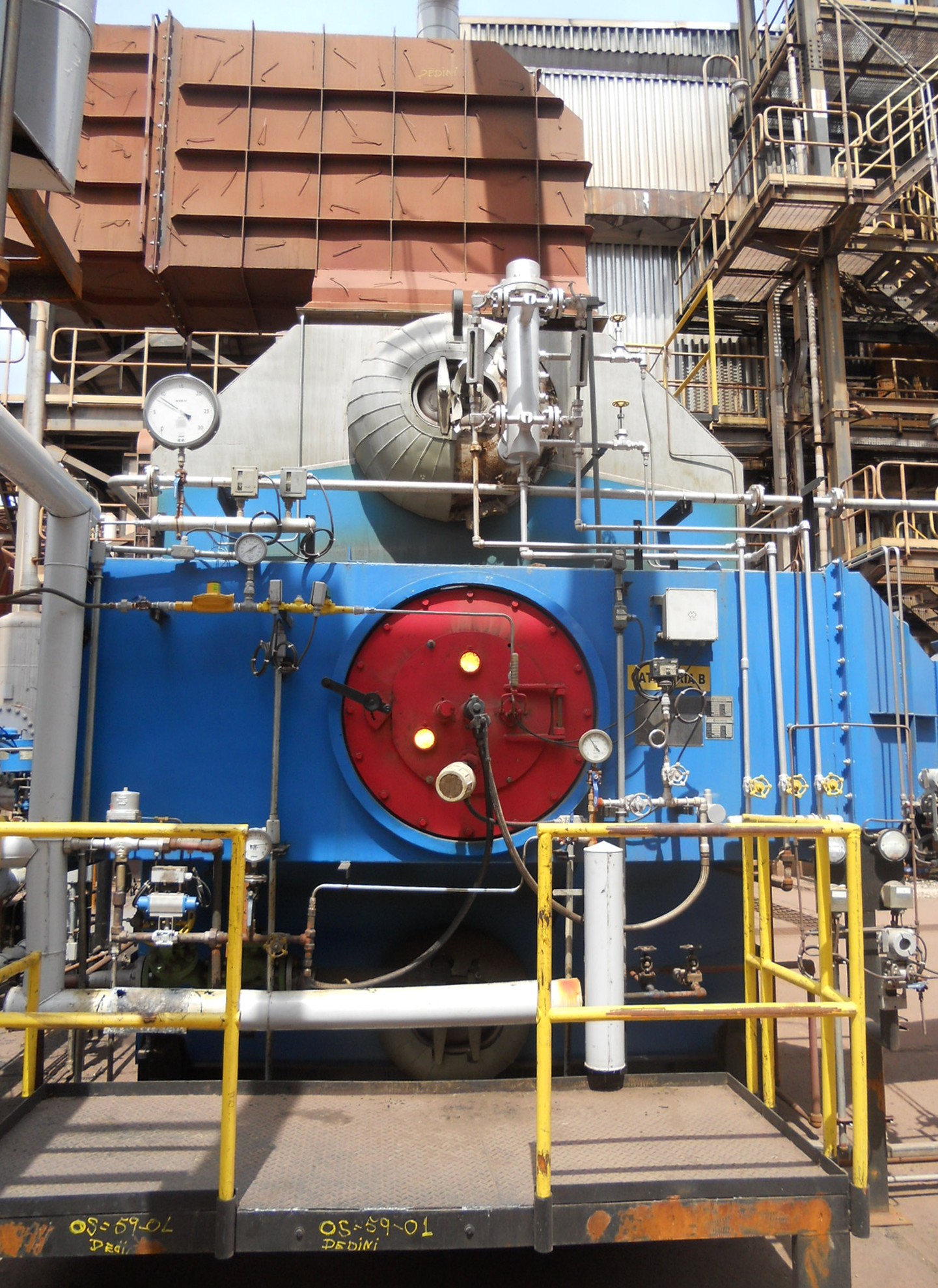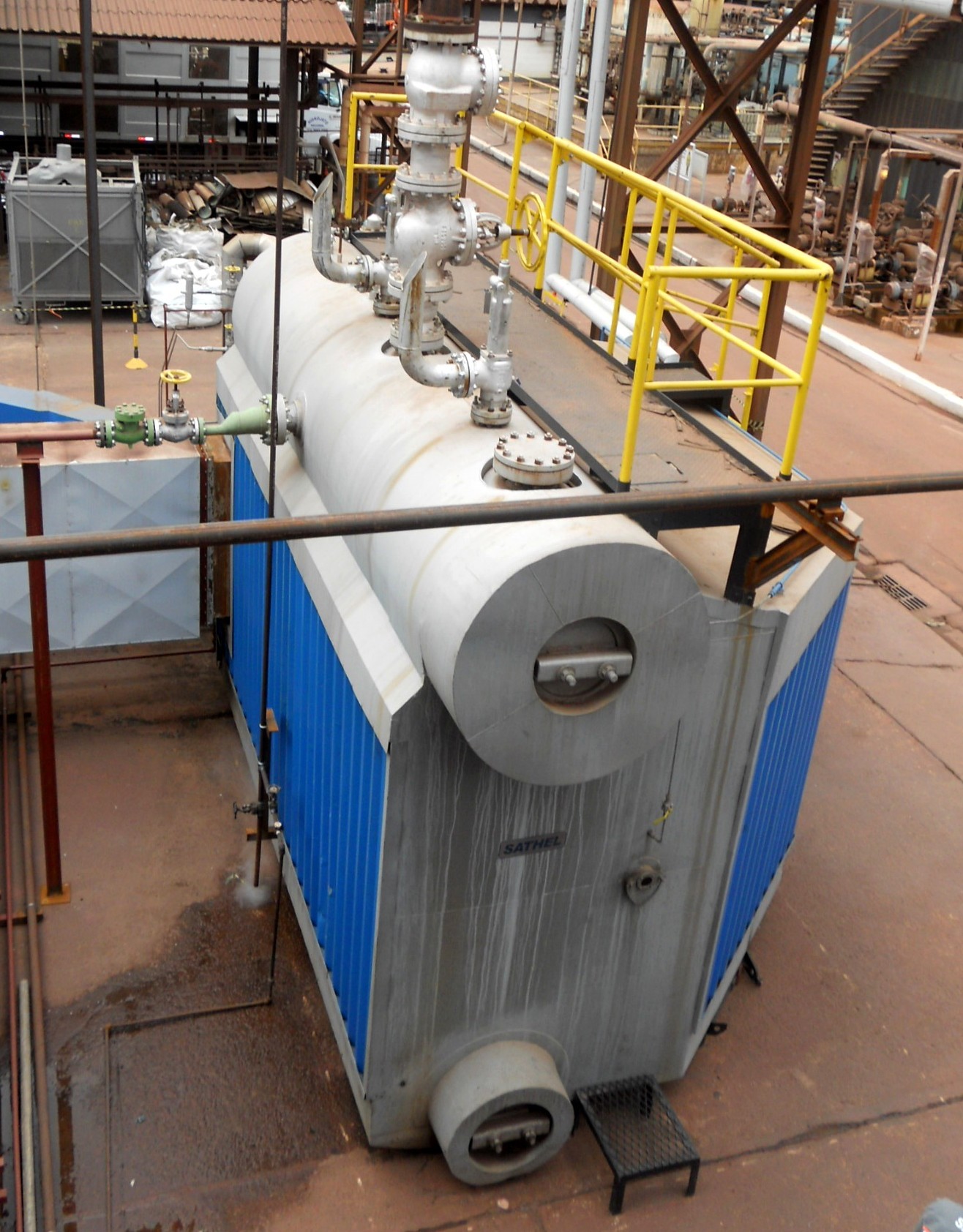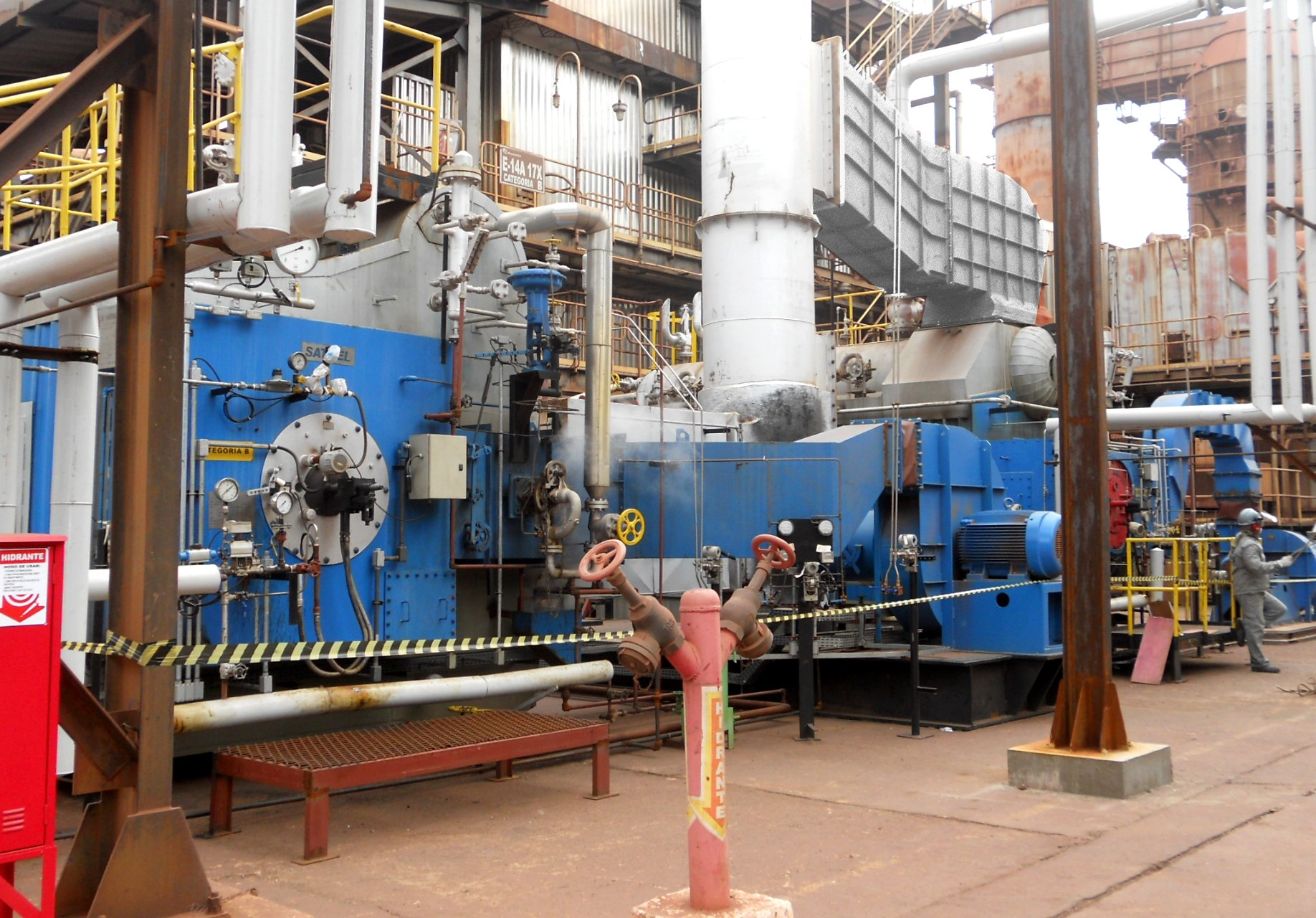 Fabricante da Caldeira: CBC – Indústrias Pesadas S.A. Revisão: SATHEL Energia S.A. – Equipamentos & Serviços, Modelo: 14 VPC – 10W Tipo: Compacta Aquotubular, Número: 8.672, Pressão de Projeto: 24,67 kg/cm², Pressão de Teste Hidrostático: 37,0 kg/cm², Pressão de Operação: 16,0 kg/cm², Capacidade Evaporativa Nominal da Caldeira: 20 t/hora, Tipo do Vapor: Saturado, Combustível: Óleo BPF, Percentual de CO2: 10% a 13%, Percentual de O2: 2% a 4%.